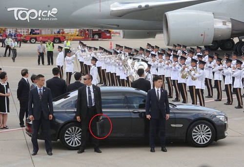 Nhật báo kinh tế Hồng Kông đưa tin, các mật vụ Trung Nam Hải cao lớn luôn đi sát ông Tập trong suốt hành trình chuyến thăm. Nổi bật hơn, họ không mang theo súng hoặc vũ khí tuy nhiên luôn có một mật vụ đeo kính râm cầm theo một chiếc vali màu đen hay còn được gọi là "cặp công vụ".