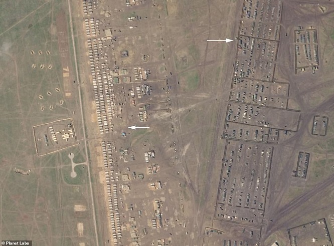 Hình ảnh do vệ tinh PlanetLabs chụp ngày 13/4 cho thấy ít nhất 1.000 phương tiện qauan sự xếp hàng trong khu vực có hàng rào đối diện với lều bộ binh.