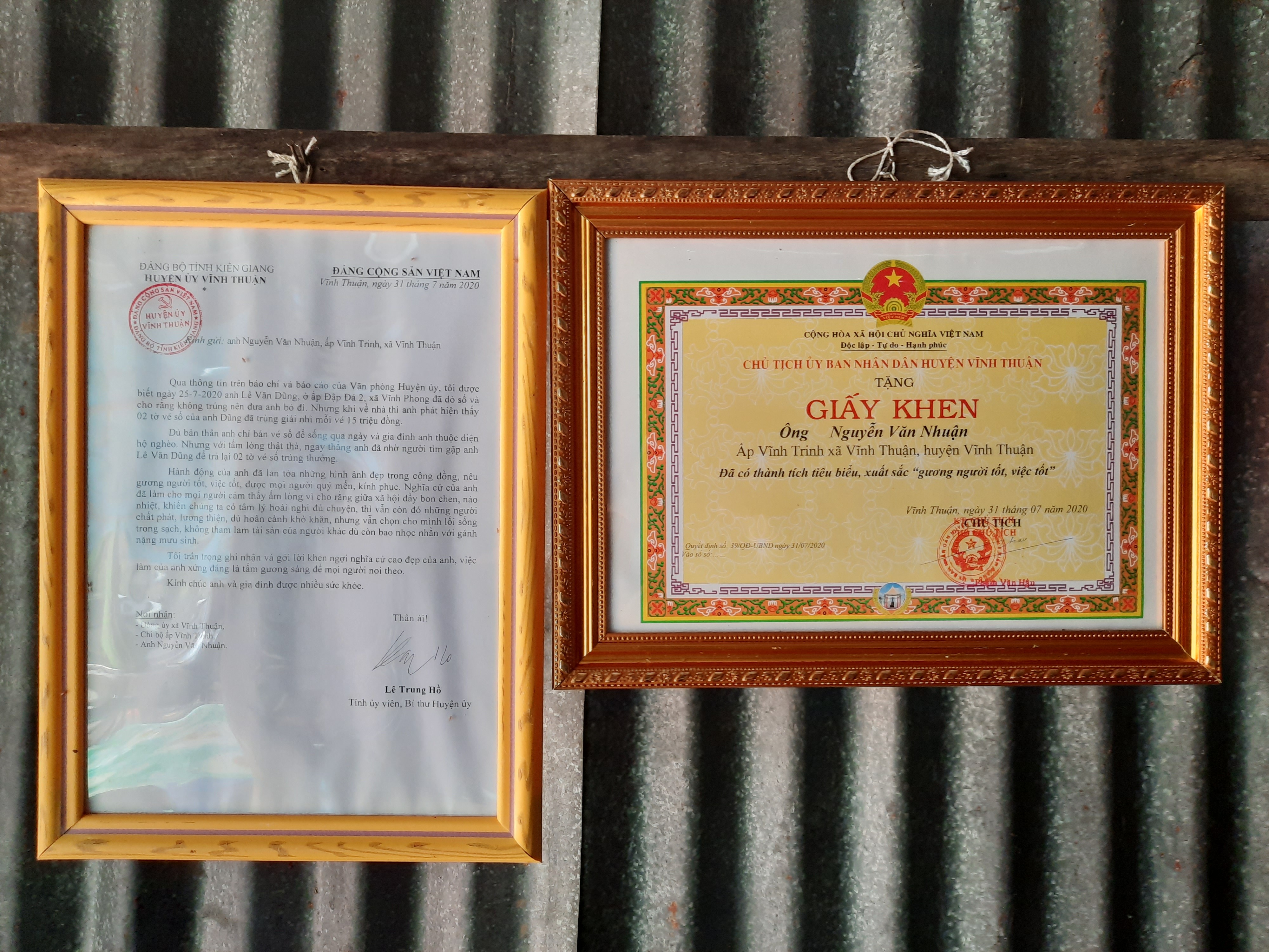 Chỉ tay về phía thư khen của Bí thư Huyện ủy Vĩnh Thuận và tấm Giấy khen của UBND huyện Vĩnh Thuận được gia đình treo trang trọng ở góc cửa ra vào, ông Trên cho biết, ông rất hãnh diện về việc làm của con trai. Ông nói: “Cái nào của mình sẽ là của mình, còn không phải của mình nếu có lấy ăn cũng không ngon, ăn hồi hộp lắm...nên trả cho khỏe lương tâm”.