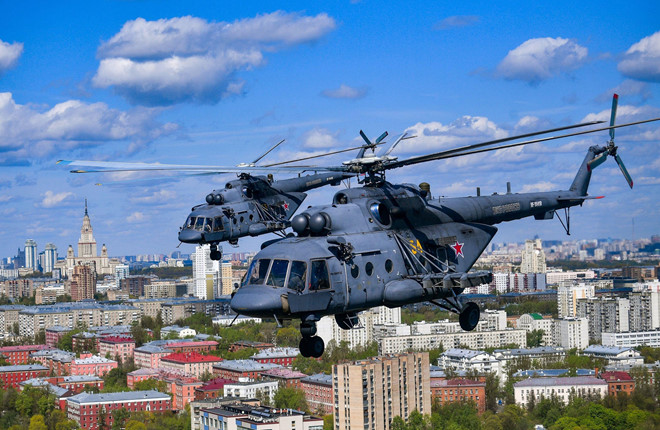 Trực thăng Mi-8 bay biểu diễn trong sự kiện ngày V-Day. Ảnh: Sputnik. |