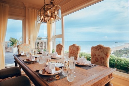 | Bàn ăn nhìn 1 bên là biển, 1 bên là núi. |