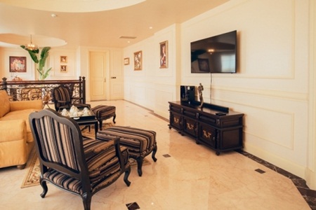 Nội thất trong căn penthouse được trang trí theo phong cách Tây phương với hai gam màu vàng, trắng làm chủ đạo. Tất cả các vật dụng đều được thiết kế công phu, tỉ mỉ đến từng chi tiết. Có thể thấy tinh thần sang trọng luôn được chủ nhân căn nhà đề cao ở mọi ngóc ngách.
