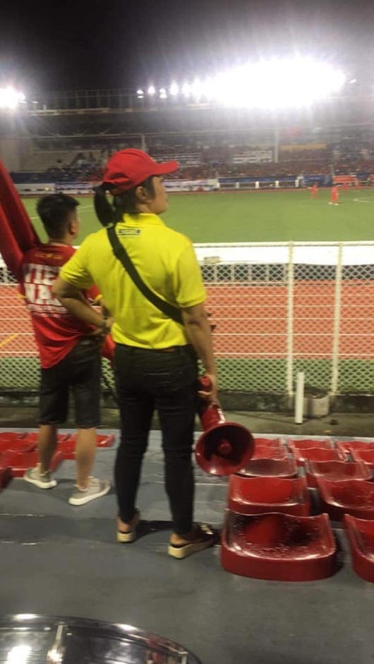 Nhiều người phải bật cười trước phong cách cổ vũ khá độc, lạ của vị nữ CĐV này. Đáng chú ý, nữ CĐV thậm chí còn cầm theo loa mini để có được tiếng cổ vũ to đến như vậy.