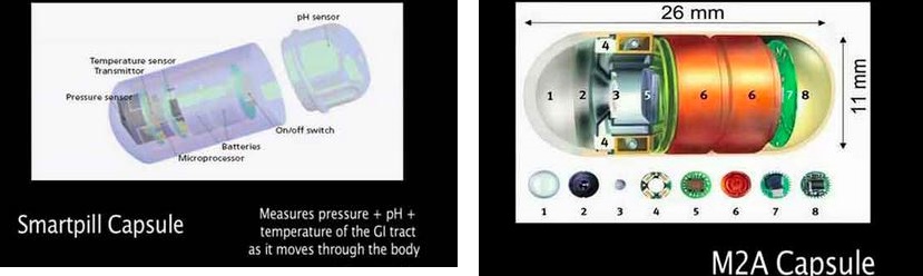 | Hai viên nhộng chứa cammera siêu nhỏ và máy quan sát vô tuyến. |