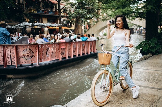 Diện quần jean, áo trắng đơn giản với chiếc máy ảnh đeo trên cổ và xe đạp màu xanh xinh xinh, Hiền Thục trông như cô sinh viên đang du học ở xứ sở cờ hoa. |