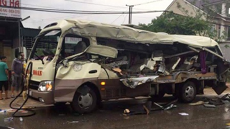 Tại hiện trường vụ tai nạn giao thông, chiếc xe khách bị hư hỏng nặng, dập nát nhiều bộ phận. Ảnh: Tri Thức Trực Tuyến |