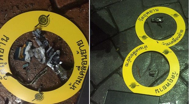 Những mảnh bom được đánh dấu tại hiện trường ngay sau vụ nổ là bằng chứng cho thấy đây là những quả bom liều chết nhưng thực tế chúng gây ra mức thương vong thấp. Ảnh: Matichon. |