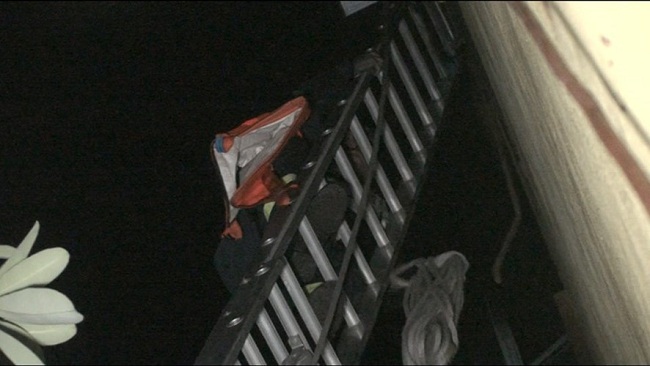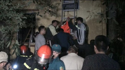 Do ngọn lửa cháy lớn, dữ dội nên lực lượng chức năng phải bắc thang từ phía sau ngôi nhà để tiếp cận đám cháy cũng như các nạn nhân. Ảnh: Kiến Thức |