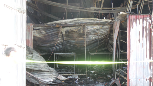 | Nhà xưởng một tầng, rộng gần 200 m3 cháy trơ trụi. Những tấm tôn lợp mái và tôn bao quanh xưởng nằm ngổn ngang, che chắn hết lối đi. (Ảnh VnExpress) |