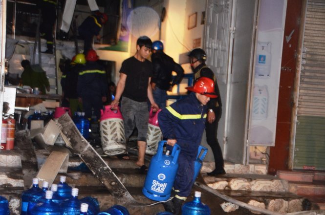 Hàng chục bình gas lớn nhỏ được đưa ra khỏi hiện trường vụ nổ. (Ảnh: Tuổi trẻ). |