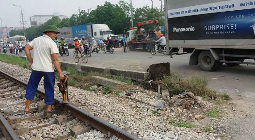 Công nhân đang phải sửa lại đường ray tàu hỏa sau cú va chạm mạnh. |