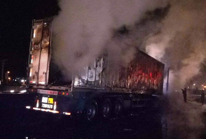 Chiếc xe đầu kéo và container đã bị cháy hỏng toàn bộ. Ảnh: Dân Việt |