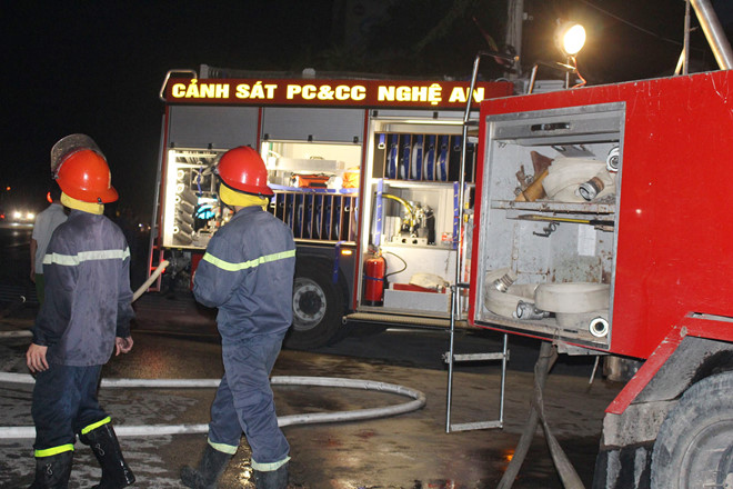Khoảng 10 phút sau, xe cứu hỏa cùng lực lược Cảnh sát PCCC Nghệ An có mặt tại hiện trường dập tắt đám cháy, chiếc xe đầu kéo và container đã bị cháy hỏng toàn bộ.