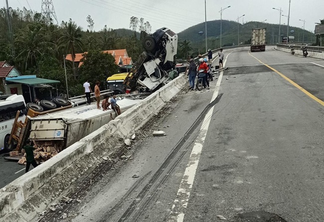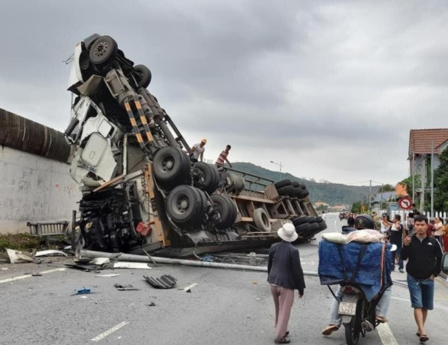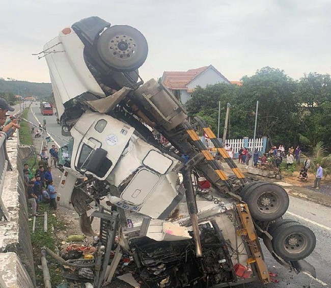 Cú rơi làm cabin xe container bị hư hỏng nặng, nằm chổng ngược lên trời. Thùng container nằm chắn ngang đường, hàng chục mét lan can cầu, cột đèn bị hư hỏng.
