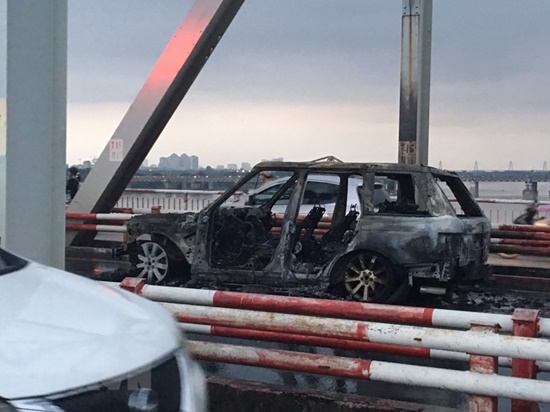 Hiện trường vụ xe ô tô Range Rover bất ngờ bốc cháy ngùn ngụt trên cầu Chương Dương. |