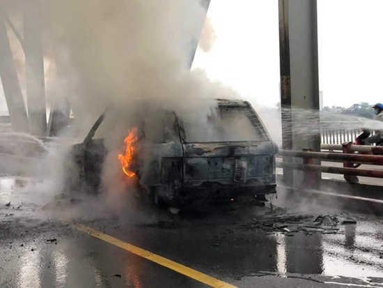 Tại hiện trường, chiếc xe bốc cháy tại làn giữa dành riêng cho ôtô hướng đi sang quận Long Biên. Ngọn lửa cháy dữ dội bao trùm toàn bộ xe, từ xa cũng thấy cột khói đen bốc lên cao hàng chục mét.