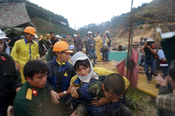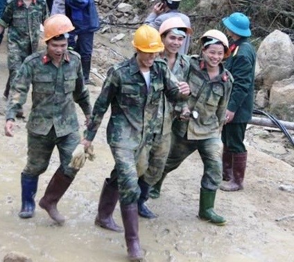 Các công binh cõng một nạn nhân ra khỏi hầm. (Ảnh: Tuổi trẻ). |