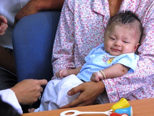 Các phương diện khác như phát triển vận động, tâm lý của bé khá tốt. Lần tái khám trước, các bác sĩ lo ngại các hoạt động bên trái của bé có vẻ yếu nhưng lần này thì hoạt động xoay về bên trái của bé đã đáp ứng tốt hơn. Với trẻ ở khoảng 3 tháng tuổi thì giới hạn chức năng như bé Phát là bình thường.
