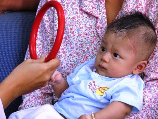 Bé Phát hoàn toàn nhanh nhẹn khi nhìn các vật mà bác sĩ đưa. (Ảnh: Người Lao động) |