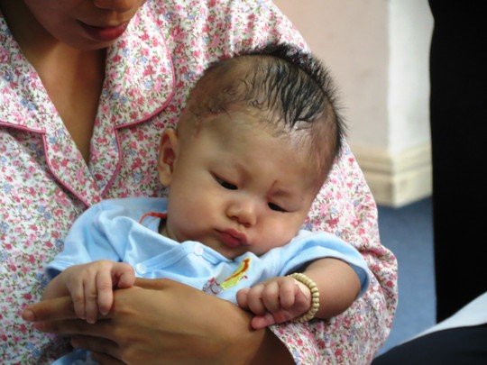 Hình ảnh đáng yêu của bé Phát ngày tái khám định kỳ. |