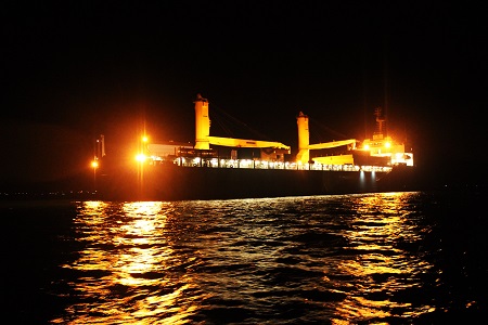 Tàu vận tải Rolldock Star (Hà Lan) chở theo tàu ngầm HQ-184 Hải Phòng tại vịnh Cam Ranh, đêm 28/1. Ảnh: Dân trí. |