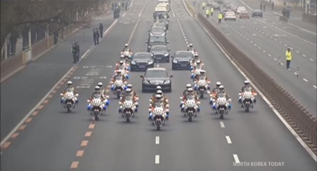 | Ông Kim Jong-un và phu nhân Ri Sol Ju di chuyển ở thủ đô Bắc Kinh trên một chiếc xe limousine được hộ tống bởi 21 môtô đặc nhiệm, tờ South China Morning Post dẫn lời thuyết minh của kênh truyền hình KCTV. Ảnh chụp màn hình: Tri thức trực tuyến |