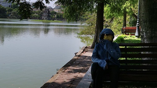 Dù đã ngồi dưới bóng mát của hàng cây ven Hồ Gươm, người phụ nữ này vẫn phải bịt kín mặt vì những luồng gió nóng luôn phả vào mặt. (Ảnh: VietnamNet) |