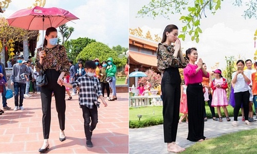 Trước đó cô cũng cùng mẹ và con trai Su Beo đến viếng thăm đền thờ Tổ nghiệp của nghệ sĩ Hoài Linh trong trang phục giản dị.