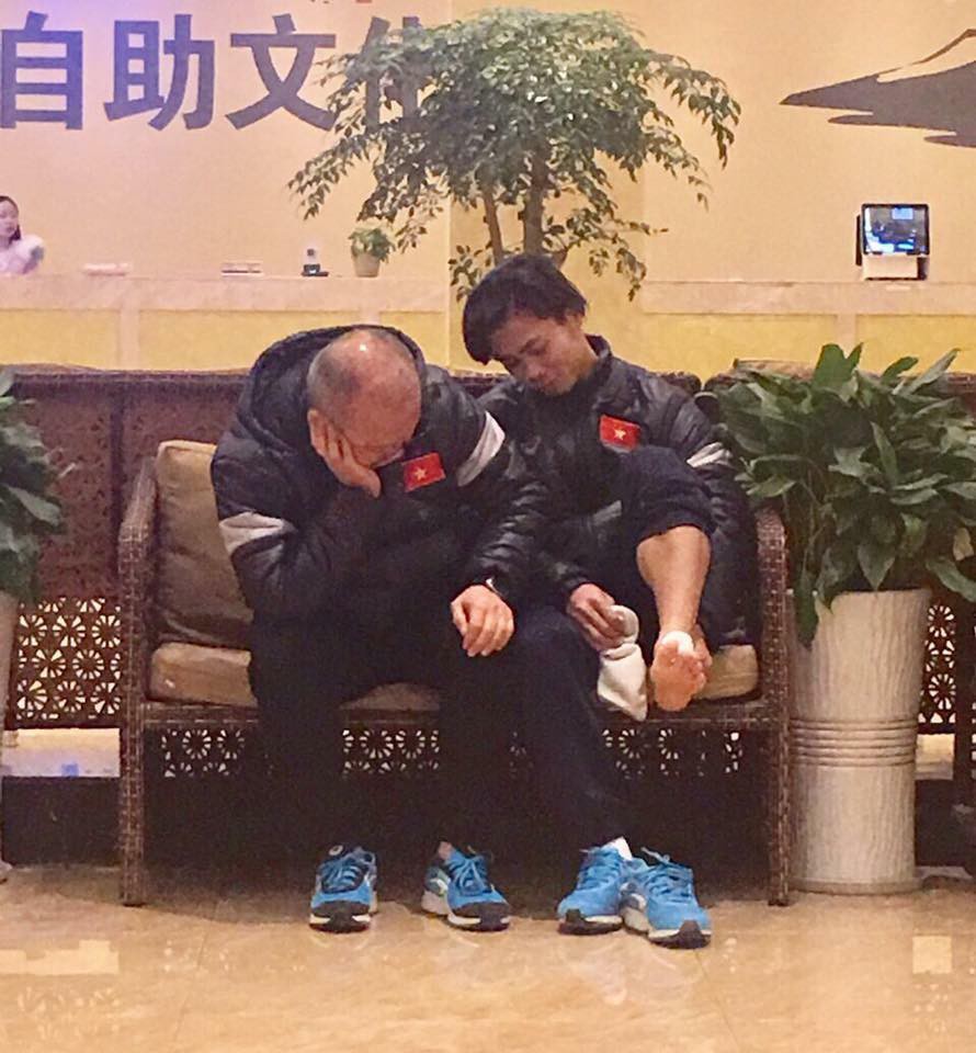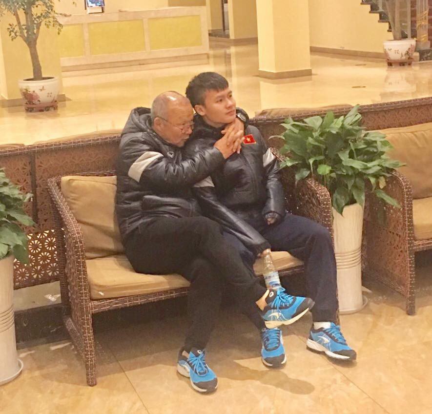 Không ít lần người hâm mộ bắt gặp ông Park Hang Seo tựa đầu vào vai Trọng Đại để ngủ, ôm hôn các cầu thủ sau khi thắng trận và cả massage cho những cầu thủ đang bị đau như Đình Trọng.