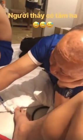 Hậu vệ Trần Đình Trọng được thầy Park Hang Seo ân cần massage chân sau những giờ thi đấu căng thẳng. |