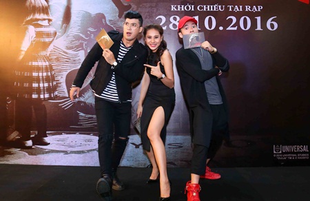 Xuất hiện trên thảm đỏ buổi ra mắt phim “Trò chơi gọi hồn 2” tối 25/10, cả ba chọn trang phục tone đen sang trọng nhưng không kém phần cá tính. Hồ Bích Trâm cho biết, cô vốn sợ ma nên vì hai người đàn ông bên cạnh mình rủ rê nên cô quyết định thử thách sự kiên nhẫn và cố gắng vượt qua nỗi sợ hãi.