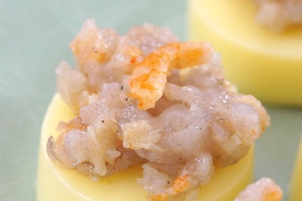 - Bước 5: Dùng thìa xúc hỗn hợp tôm chia đều lên các miếng đậu.