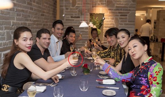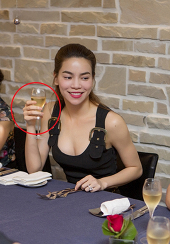 Trong khi mọi người đều cầm ở đế ly rượu thì ca sĩ Hồ Ngọc Hà lại cầm luôn vào phần bầu ly. Điều này là tối kị trong cách uống rượu vang hoặc sâm panh.