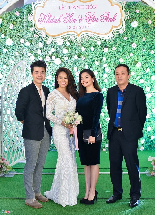 Trong tiệc cưới, Vân Anh mặc váy ren trắng kiểu dáng đơn giản, không cầu kỳ. Còn chú rể Khánh Sơn mặc vest tuxedo. Không gian tiệc cưới được trang trí sang trọng với tông màu trắng chủ đạo.