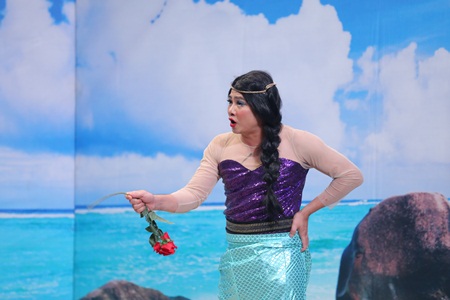 Với tóc thắt bím dài và váy cúp ngực, Tự Long đầy tự tin khi hóa thân thành nàng tiên cá trước sự trầm trồ của các nhân viên hậu cần. Không những thế, danh hài đất Bắc còn tự tin khoe bờ môi dày hờ hững đầy mời gọi.