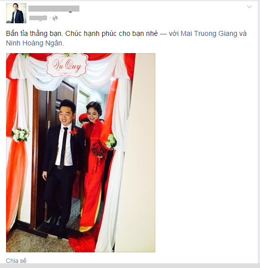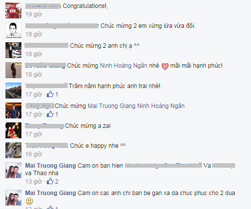 Cặp uyên ương Ninh Hoàng Ngân và Mai Trường Giang nhận được rất nhiều lời chúc từ bạn bè, đồng nghiệp. |