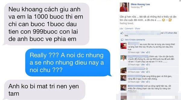 Diễm Hương cũng đã chia sẻ những dòng tin nhắn tình cảm, ngọt ngào giữa cô và bạn trai trên Facebook: “Cần gì hơn nữa… Bởi tất cả những thứ em thiếu và cần tìm cho cuộc đời mình, anh đã cho em…”. Nội dung tin nhắn người yêu gửi cho Diễm Hương: “Nếu khoảng cách giữa anh và em là 1000 bước thì em chỉ cần bước 1 bước, còn 999 bước còn lại để anh bước về phía em”.