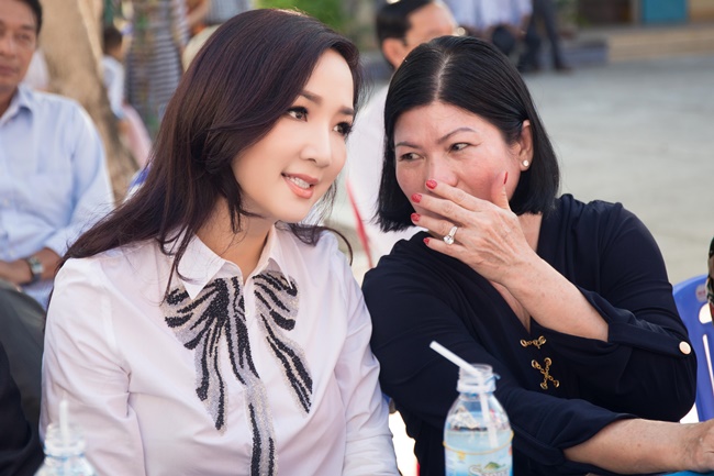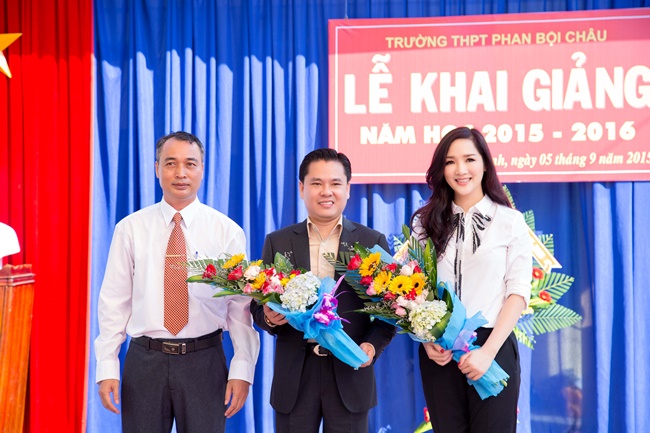 Hoa hậu Giáng My hội ngộ Hoa hậu Ngọc Diễm tại lễ khai giảng năm học mới của trường THPT Phan Bội Châu. |