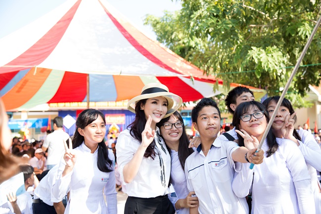 Sáng ngày 5/9 Hoa Hậu đã lên xe sớm ghé thăm ngôi trường Phan Bội Châu ở Cam Ranh, Khánh Hòa dự lễ khai giảng năm học mới và trao tặng 10 máy vi tính cho trường.