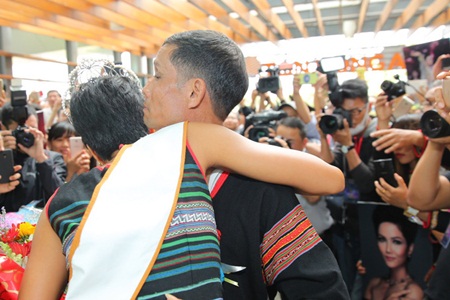 Vừa nhìn thấy gia đình và mọi người trong buôn làng đến đón mình, H'Hen Niê đã không kìm nổi được cảm xúc mà òa khóc.