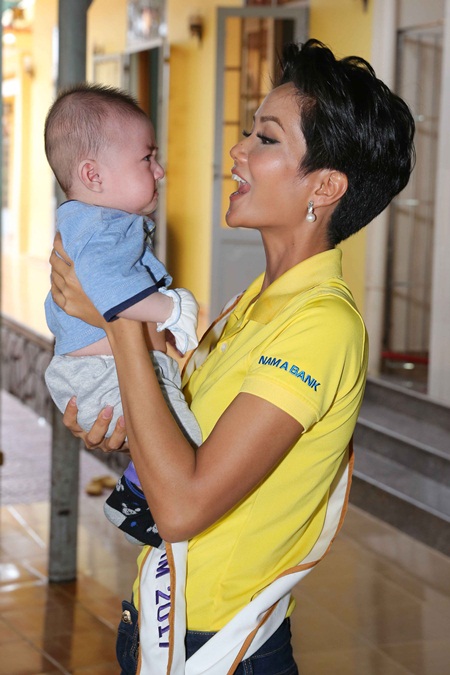 Không trang phục lộng lẫy như đêm chung kết, Hoa hậu H’’hen Niê và Á hậu Hoàng Thùy, Á hậu Mâu Thủy đầy giản dị trong trang phục áo thun, thân thiện chơi đùa cùng các em nhỏ.
