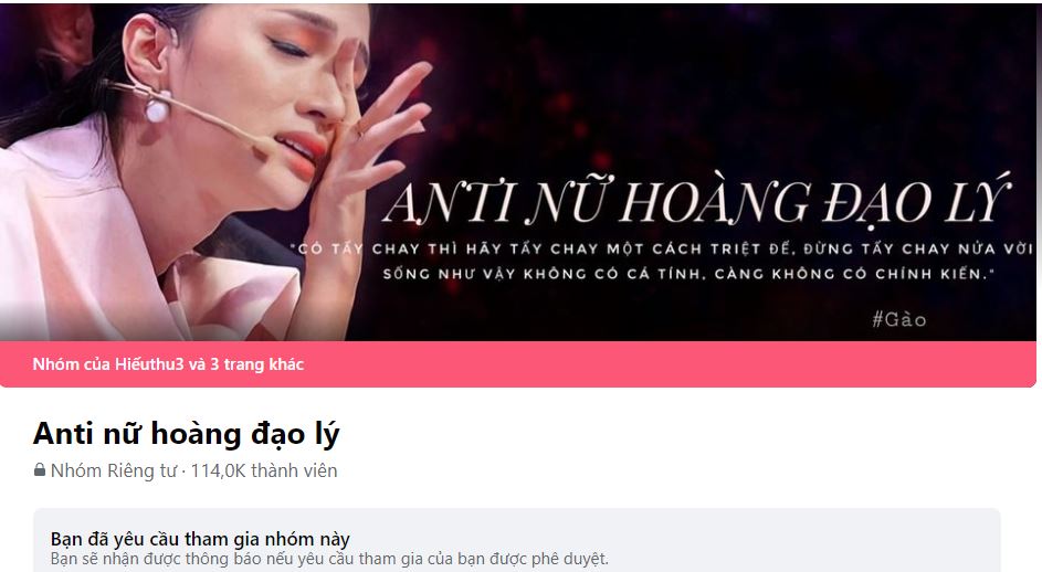 Tuy nhiên, gần đây, trên facebook xuất hiện nhóm kín mang tên "Anti nữ hoàng đạo lý với 100.000 thành viên vào tối 29/10. Đến ngày 30/10 con số này đã tăng lên tới 114.000.
