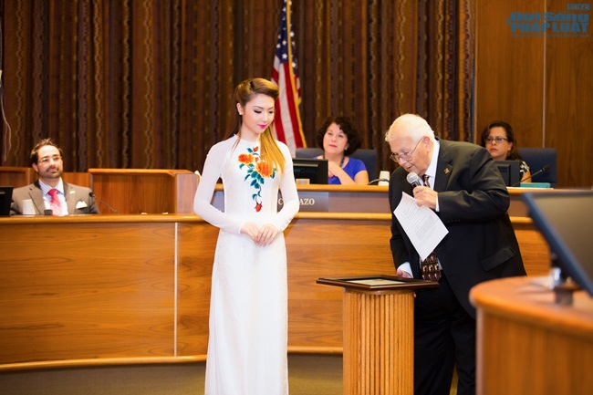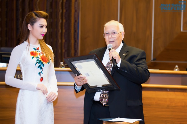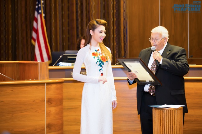 Ông cũng vinh danh cô đã các chương trình từ thiện cho trẻ em, cho những người gia neo đơn, người vô gia cư tại hoa kỳ, giữ được bản sắc của dân tộc. Dịp Trung Thu vừa qua cô cùng ban Hoa hậu và bà Phó Thị Trưởng đứng ra tổ chức trung thu cho 10 ngàn người sống ở vùng San Jose và phát hơn 8.000 lồng đèn cho trẻ em thiếu nhi.