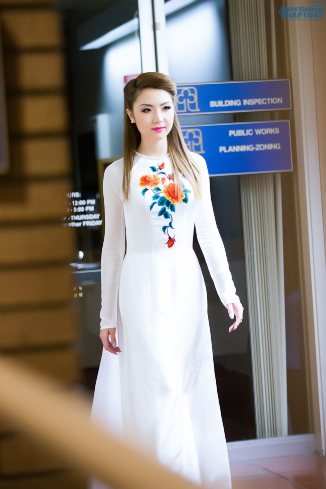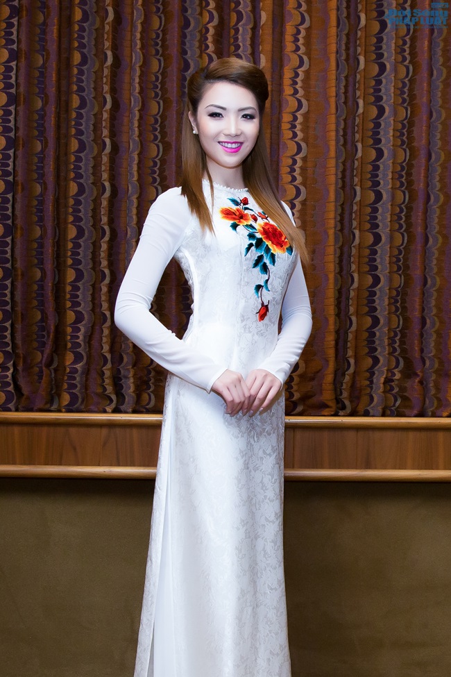 Chiếc áo dài cô đang mặc được làm từ vải lụa thêu tay của nhà thiết kế Thuận Việt , cô chọn chiếc áo dài này để cho mọi người thấy và biết dù lớn lên trên đất Mỹ nhưng cô vẫn luôn tự hào mình là người con gái Việt Nam.