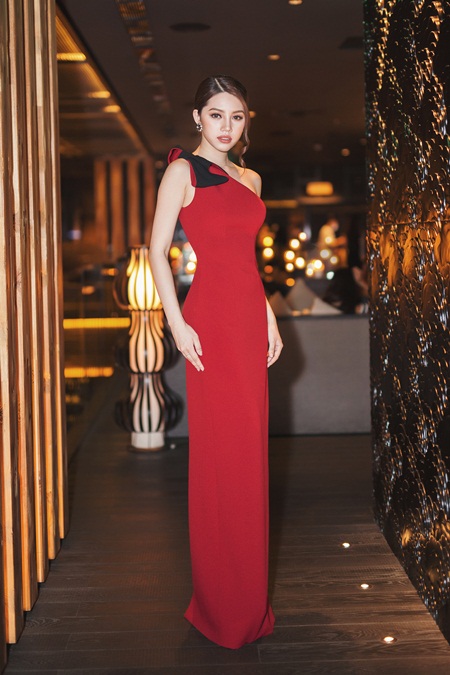 Giai nhân diện bộ đầm màu đỏ bordeaux của nhà thiết kế Lê Thanh Hòa. Điểm nhấn của chiếc đầm ở chỗ lệch cầu vai với chiếc nơ xinh xắn tông đỏ đen, phối ăn ý với cultch sequin lấp lánh. Vẫn là vẻ đẹp tạo nên “thương hiệu” của Jolie Nguyễn với ánh mắt hồ thu và làn môi căng mọng.