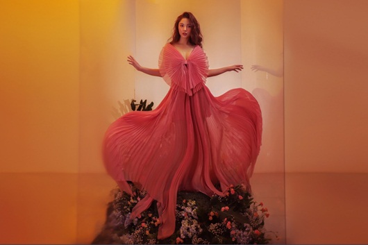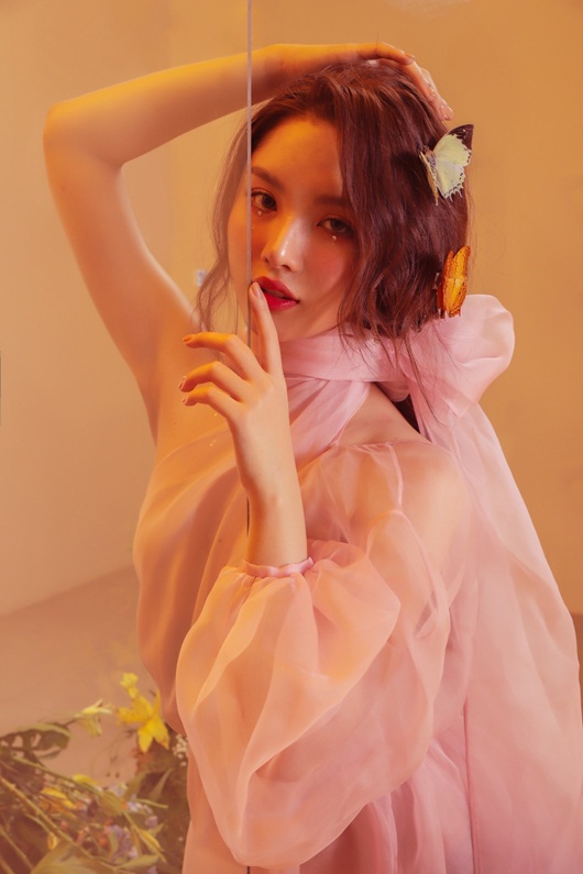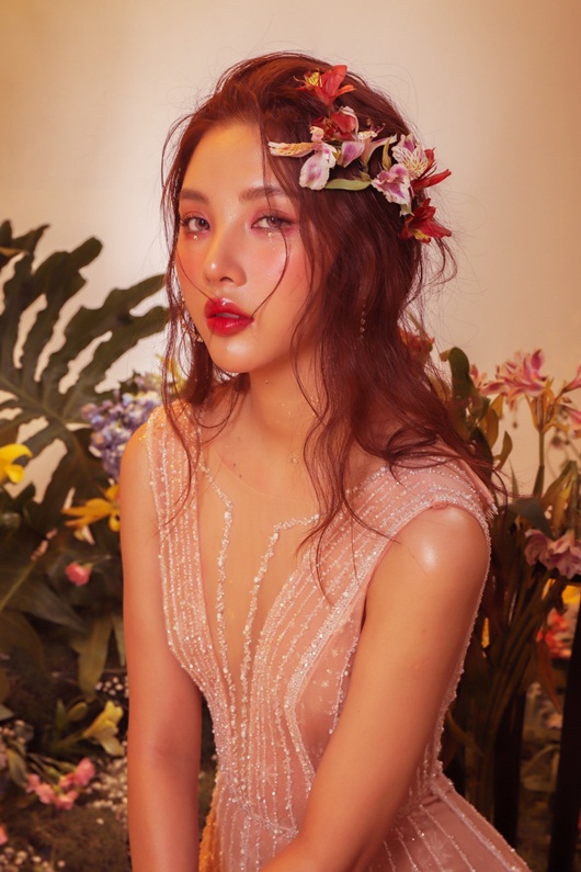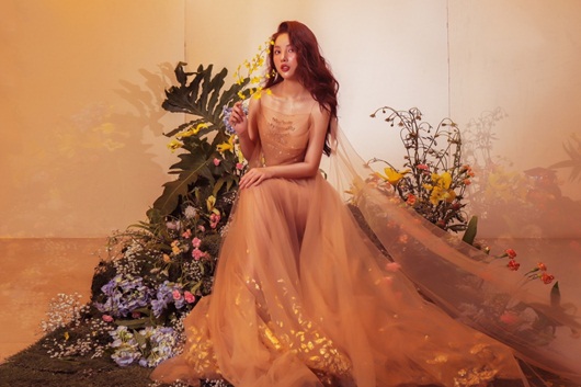 Trong bộ ảnh mới, Mỹ Huyền hoá thân nàng công chúa cổ tích xinh đẹp nhưng lại bị nhốt trong một chiếc tủ kính với rất nhiều cây cỏ, hoa lá. |