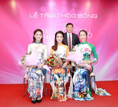 | Xuất hiện trong buổi nhận học bổng, Hoa hậu Mỹ Linh, Á hậu Thanh Tú và ‘Người đẹp nhân ái’ Thủy Tiên đều lựa chọn trang phục áo dài do đàn chị là Hoa hậu Ngọc Hân thiết kế. |
