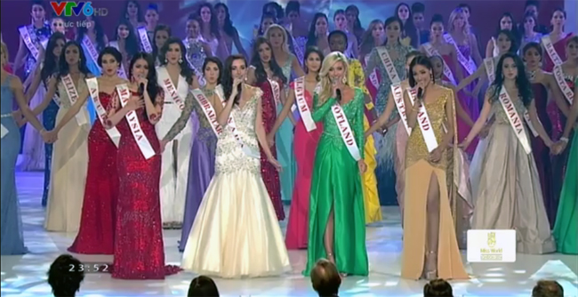 23h23: Công bố Top 5 Hoa hậu Thế giới, không theo thứ tự gồm: Hoa hậu Hungari, Úc, Nam Phi, Mỹ và vị trí cuối cùng thuộc về Hoa hậu nước chủ nhà - Anh.