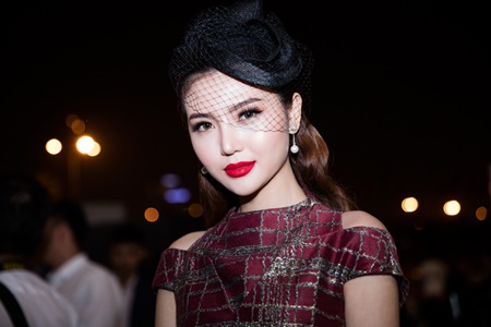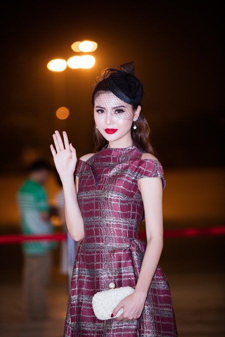 Với chiếc mũ ren lưới cổ điển, kết hợp bông tai ngọc trai và chiếc ví cầm tay sang trọng, Ngọc Duyên vô cùng nổi bật với chiếc váy màu đỏ thẫm.