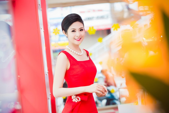(ĐSPL) - Diện bộ đầm đỏ với phần xếp ly cách điệu của nhà thiết kế Xuân Lê, hoa hậu Ngọc Hân khoe vẻ đẹp rạng rỡ, gợi cảm bên đào hoa.